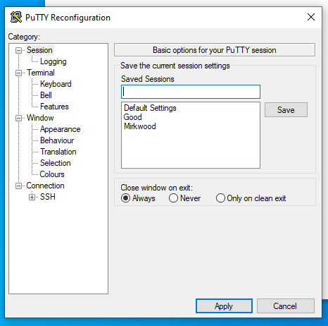 PuTTY can be customized from the PuTTY Configuration window, which opens when PuTTY is started or from the PuTTY Reconfiguration window for an active session.
