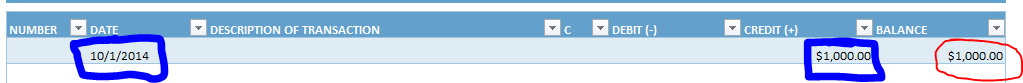 - In the Credit box (G5) enter the starting balance of $1000