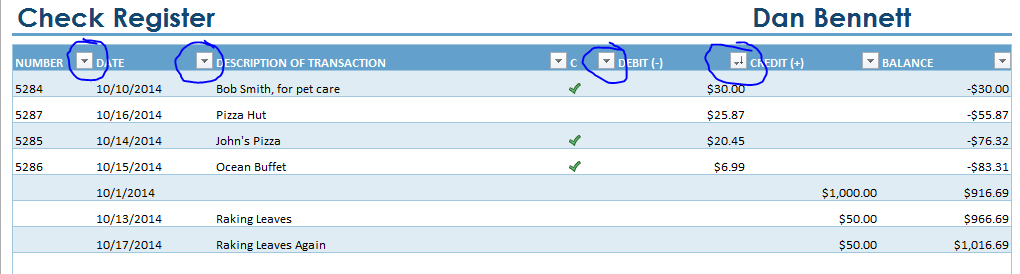 - Spend a little time sorting the register using the sorting tabs in row 4