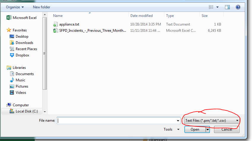 - Since it is a csv (comma separated value, a common data exchange format) you will need to change the type to be Text Files (.prn; *.txt; *.csv)