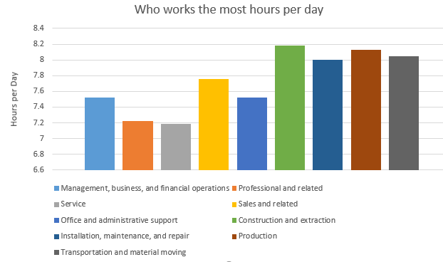 - A column chart displaying the average hours worked per day by industry
