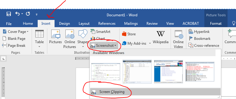 - Under the Insert Tab select Screen Shot and Screen Clipping