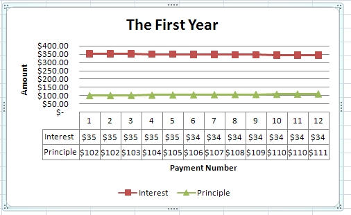[4 points] Build a line graph with markers displaying interest and principle payment for the first 12 payments.