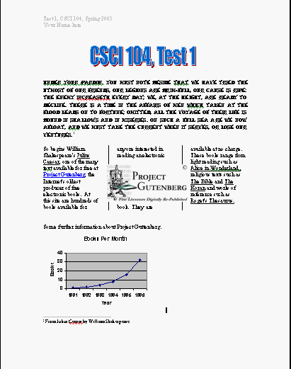 So begins William Shakespear's Julius Ceaser, one of the many texts available for free at Project Gutenberg, the Internet's oldest producer of free electronic books. At this site are hundreds of books available for anyone interested in reading an electronic book. They are avaliable at no charge. The books range from light reading such as Alice in Wonderland, religious texts such as The Bibal and the Koran, and works of reference such as Roget's Thesaurus.