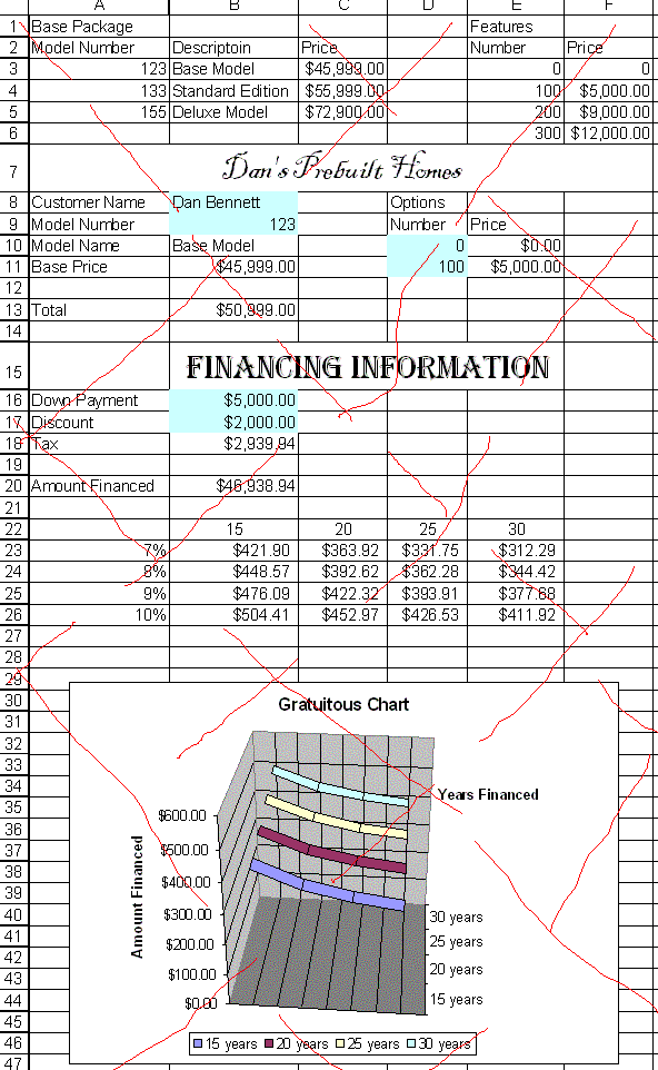 - in cells a7-f7 place the words "Dan's Prebult Homes".