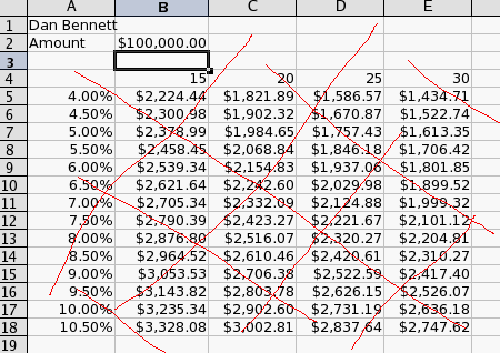 for the amount in cell b2, for the interest rate as listed in column a5-a18, for the period of years listed in B4-E30. This should be for quarterly payments.