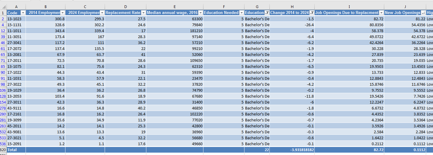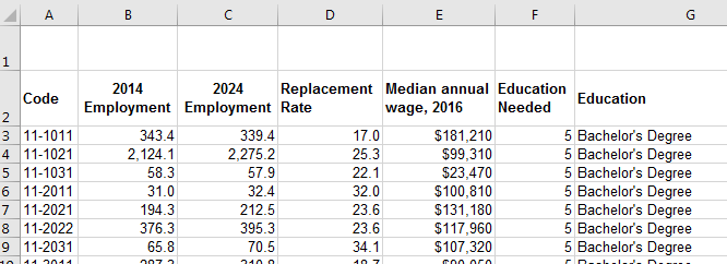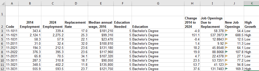 -  This worksheet contains employment data from 2014 along with employment predictions for 2024.  The Code column matches the Code column in the Occupation Names worksheet.  Current employment levels for the listed jobs are given in column B.  Predicted employment levels for  the jobs are listed in column C.   Column D contains the estimated rate at which workers in a given job will need to be replaced.  Column F contains a code which matches degree levels in the Sub Tables worksheet.  This data is from the Bureau of Labor Statistics web cite.