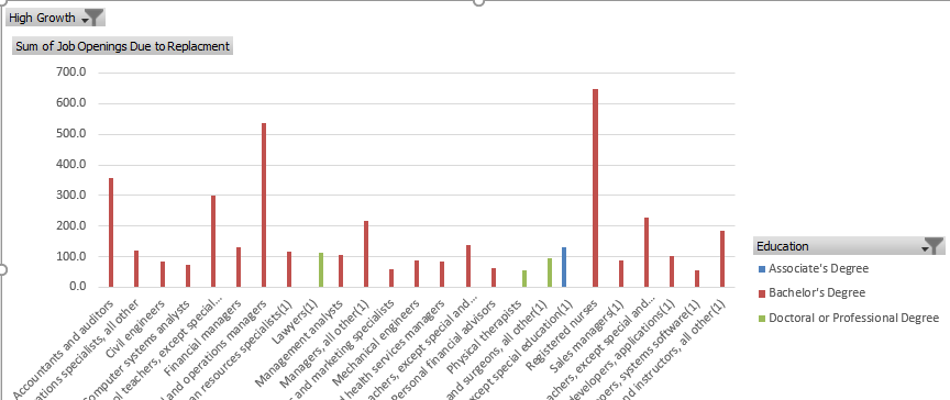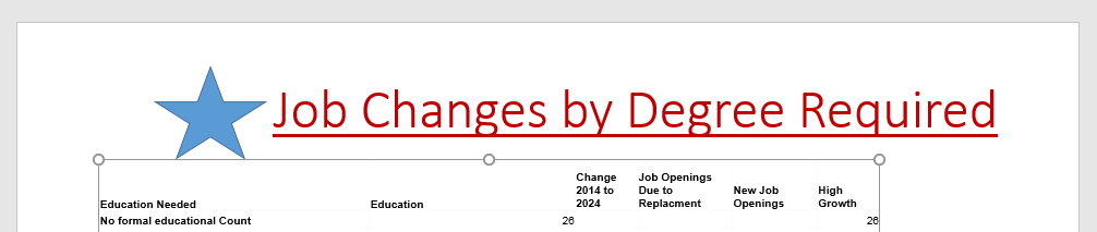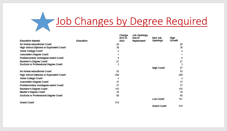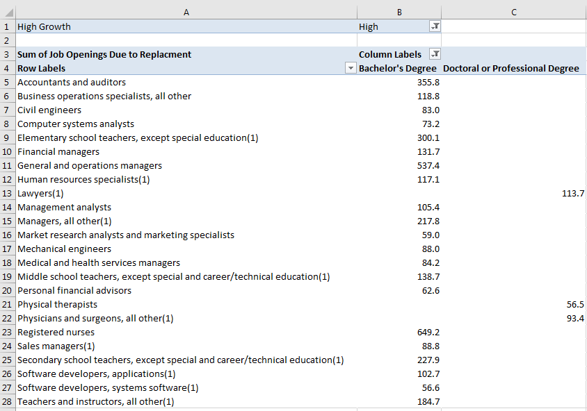 -  [6 points]  Using the data in this workbook, produce a summary of the number of high growth and low growth jobs by degree.  You should do this using a tool but not a pivot table. Your results should be similar to the following image.