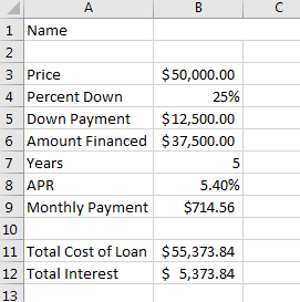 -  Go to the Start  worksheet.  Use computations to calculate the cost of a $50,000 car financed for 5 years at 5.4% interest.  The loan requires a 25% down payment.