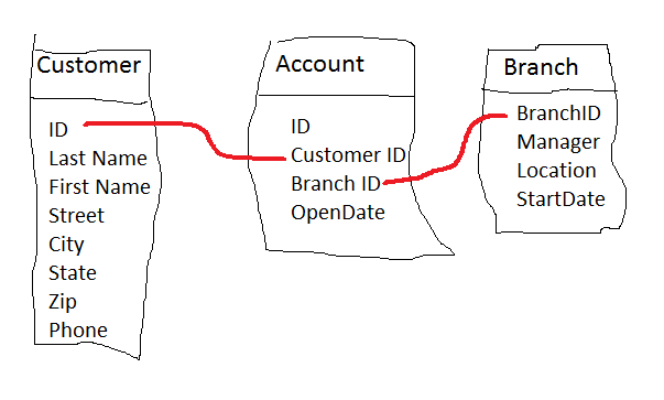 - Accounts, probably more complex, link customers to branches