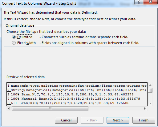 - Since your data is delimited, or marked with a character, select Delimited and Next