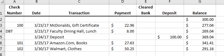 - Add a transaction with debit card, (DBT) for $8.00 for lunch at the faculty dining hall.