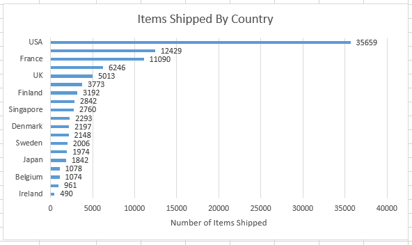 The first worksheet, labeled Units Shipped contains the number of units in each category that were shipped to each country. Be careful as this contains both a column and a row total.