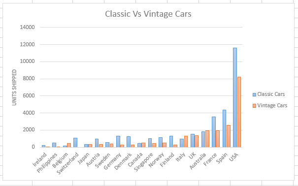 Finally create a clustered column chart to display car sales (classic and vintage) for all countries