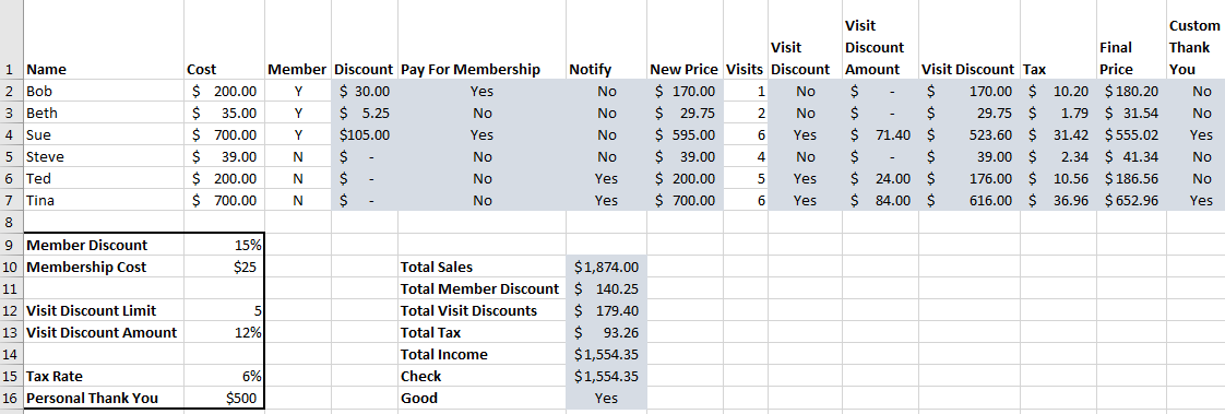 - In column N, print yes if the final price is greater than the Personal Thank You amount in B16.