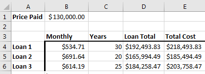 - Produce a document that allows you to compare three different versions of a house loan.