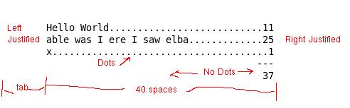 The table should contained a left aligned column of phrases and a right aligned column of lengths. The first column should be indented a tab (\t), and the second column should end 40 spaces past the tab. (See picture below)