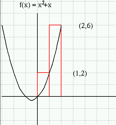 For example if the function is f(x) = x2+x and we wish to find the area under the curve from 0 to 2, in two intervals, we would do something like this:
