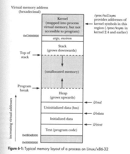 - Once loaded, the process (currently on linux, x86) has the following layout in memory.