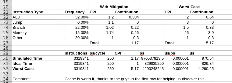 - Add a line that computes the worst possible time for this progra, no hazard mitigation or cache