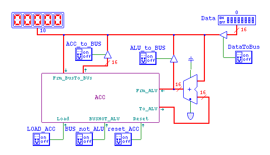 - A 1 bit BUS/ALU line, which selects the data source for the ACC. If this data on this line is low, the data source for ACC is the ALU, if the data on this line is high, the data source for the ACC is the BUS.