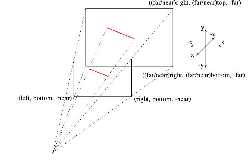 - glFrustum(left, right, bottom, top, near, far)