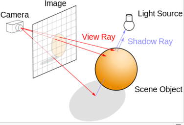 -  In ray tracing we attempt to produce "photorealistic" images by tracing rays from a camera through the view plane to objects, and eventually to light sources.