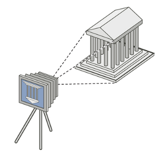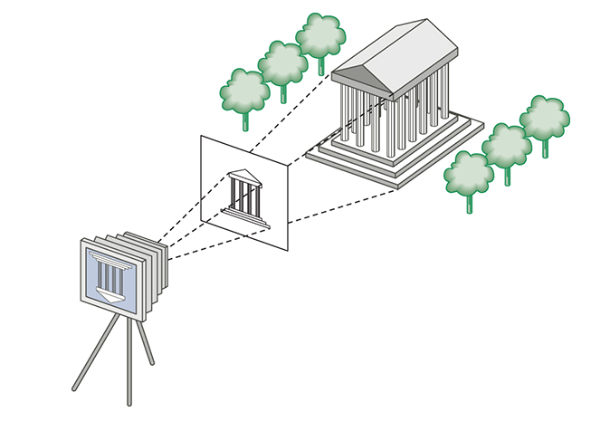 - Light strikes the images in the scene and travels through the "lense" of the camera to strike a "photographic plate" in the back of the camera.