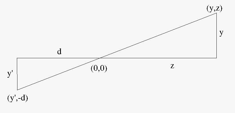 - So the new position will be $(-\frac{x}{\frac{z}{d}}, -\frac{y}{\frac{z}{d}}, -d)$