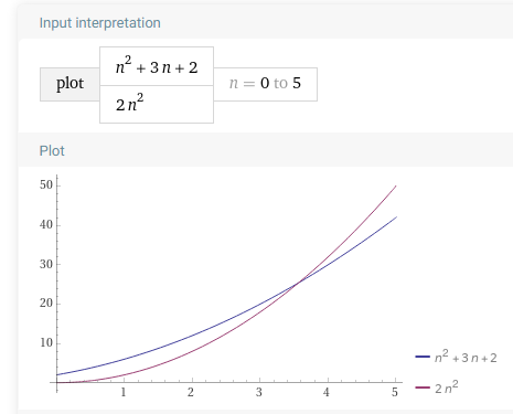 - To show this, we would need to find $c>0, n_0 > 0$ such that $n^2 + 3n + 2 \le cn^2$ when $n > n_0$.