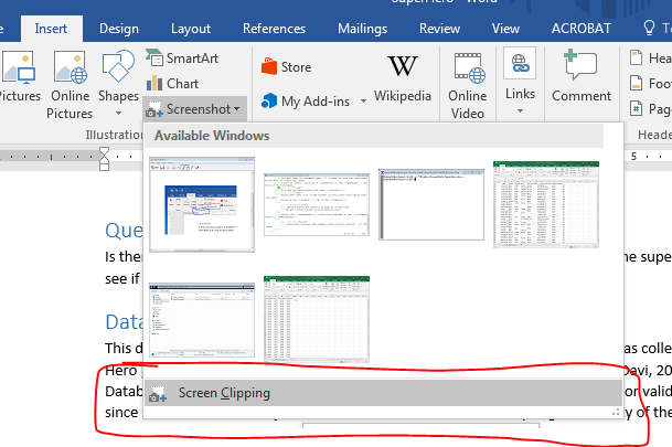 - Select the ScreenShot dialog box launcher in the Illustrations commandgroup.