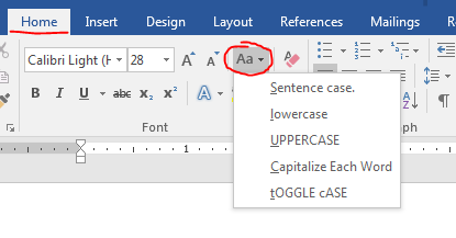 - On the Home tab, Font Workgroup use the Change Case menu to adjust the case