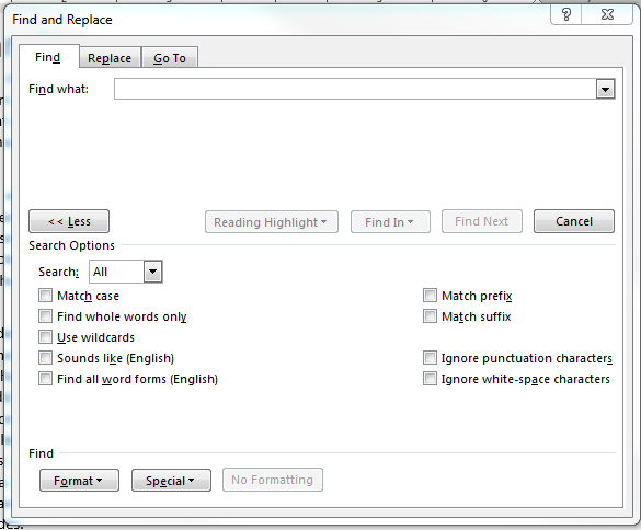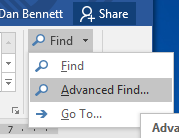 - Go to the Home Tab, Editing Group and drop down the Find menu.