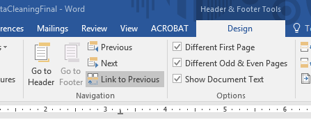 - Notice the Link to Previous toggle in the Tab and the Same as Previous alert in the heading/footer.