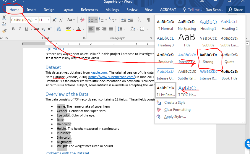 I selected strong instead of the List Paragraph style because I did not want to change the style for all list elements.