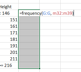 - enter =frequency(G:G,M32:M39) and press ctrl-shift-enter