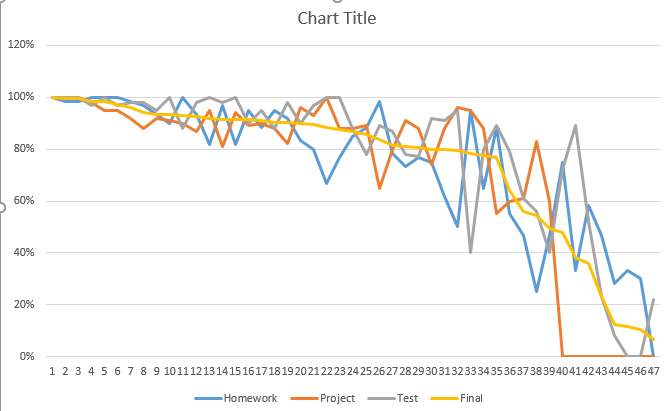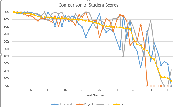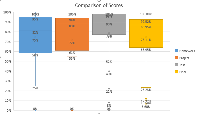- I want to build a column chart displaying Homework, Test and Final for the grades between A and F.