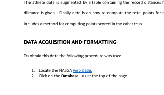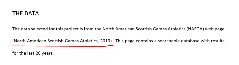 For this project we will be using the Overall rankings for the North American Scottish Games Athletics (NASGA) in 2018. This data is from NASGA's web page located here. A modified workbook containing the data is located here.