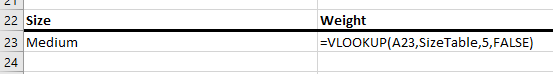 - =vlookup(A23, SizeTable, 5, False)