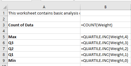 - Add a comment in cell a1 that states "This worksheet contains basic analysis of the weight field of the Cleaned Data worksheet.