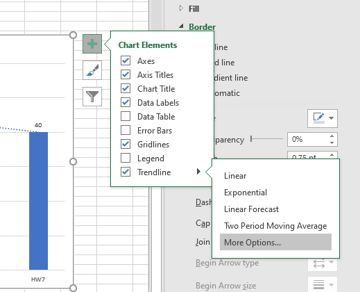 - Click on the + sign, hover over Trend Line and click on More Trend Line Options
