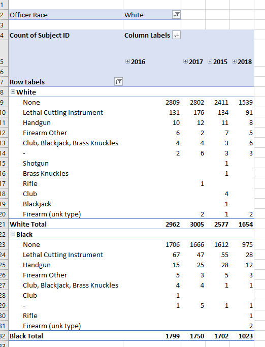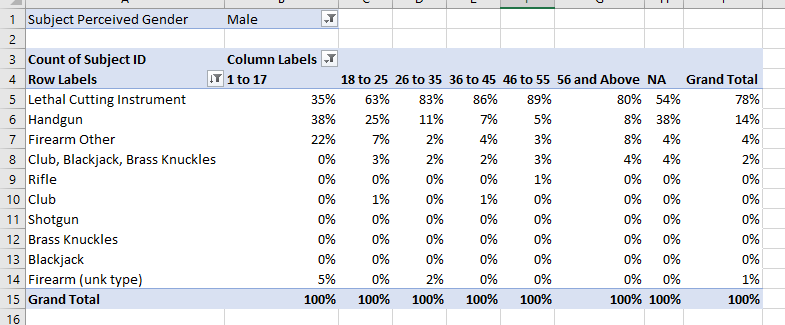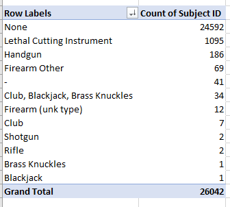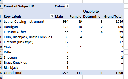 - Build new a pivot table to compare weapon type to Subject Perceived Gender