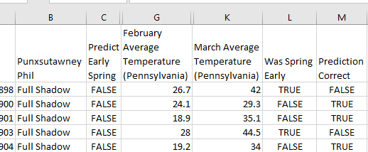 Analyze the Groundhog Day Forecasts and Temperatures from kaggle.com. I have provided a local copy if you don't want to sign up for an account. See kaggle for a description of the fields.