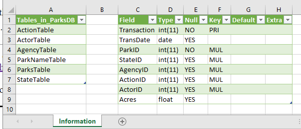 - In the information worksheet perform queries that list all of the tables, and describe the ParksTable.