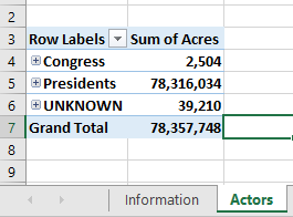 - [3 points] Build a pivot table showing the total acres changed by the various actors.