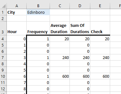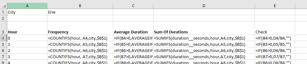 - Use a countifs function to compute the frequency for the given city for each hour.