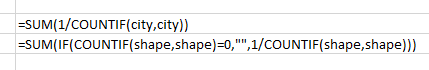- =sum(if(countif(shape,shape)=0,"",1/countif(shape,shape)))