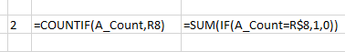 - In cell u8 put =sum(if(a_count=r$8,1))
