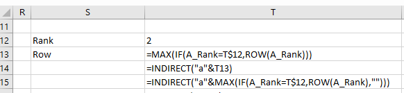 - In T13 put =max(if(a_rank=t$12,row(a_rank))) as an array function