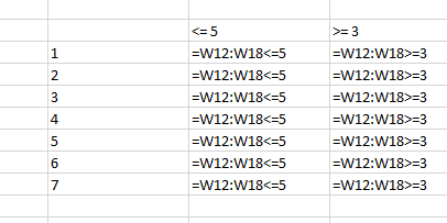 - In the next column enter =range<=5 as an array formula
